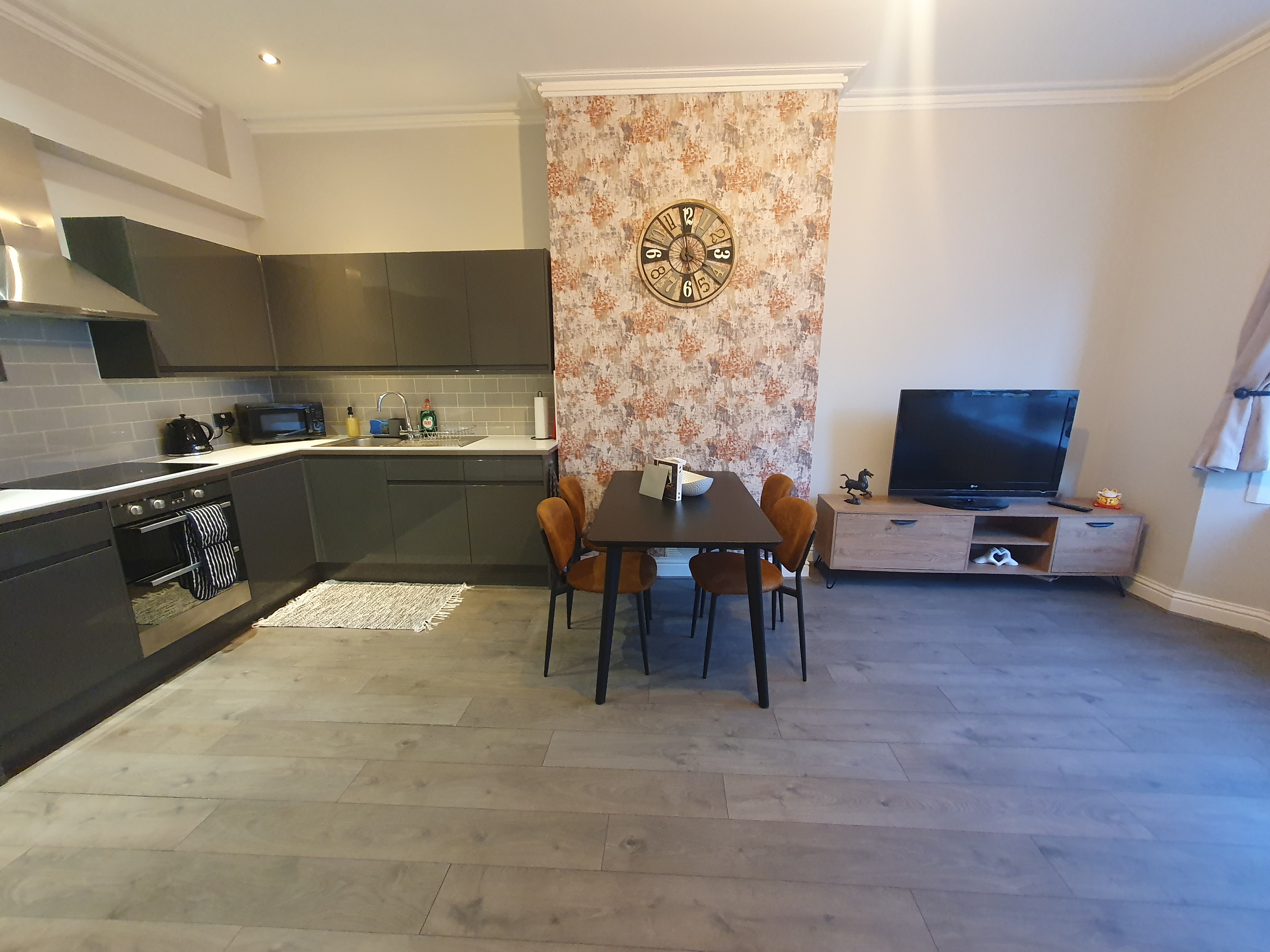 Prepare delicious meals in the fully equipped kitchen, featuring modern appliances including a fridge, freezer, microwave, toaster, oven, and induction hobs.